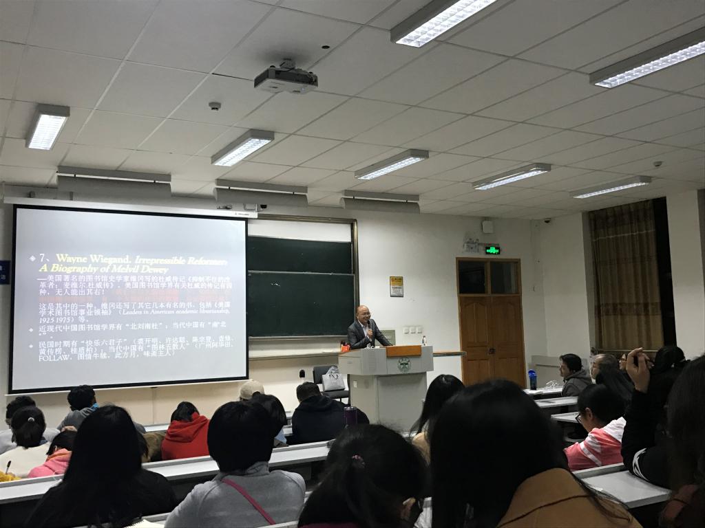 在推荐中外图书馆学书目部分,郑老师推荐了10本中文书籍:黄宗忠《图书馆学导论》、严文郁《中国图书馆发展史:自清末至抗战胜利》、程焕文《晚清图书馆学术思想史》、郑永田《美国公共图书馆思想研究(1731——1951)》、程焕文《中国图书馆学教育之父沈祖荣评传》(1997)、严文郁《美国图书馆界名人略传》、程焕文《图书馆精神》、彭敏惠《文华图书馆学专科公司的创建与发展》、王波《快乐的软图书馆学》、孟雪梅《中国近代教会大学图书馆研究》;英文书目有张沙丽译《图书馆学导论》、谢拉《公共图书馆基础:新英格兰公共图书馆运动的起源》、美国教育部《Public libraries in the United States of America: their history,condition ,and management: Special report ,part I》等。郑老师用轻松愉快的调侃加上个人观点对以上书目做现场评价,吸引了在座同学的注意力,教室内笑声连连。