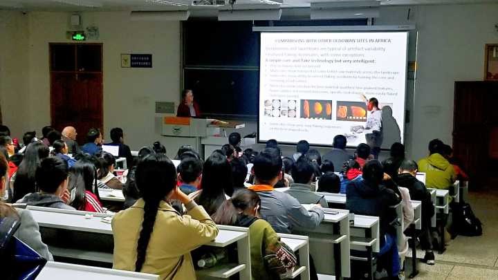 之后,凯瑟琳·库曼教授结合她所参与的奥杜韦时代南非地下洞穴遗址考察,以图片形式展示了考古发掘的数十件石制品、动植物遗骸,以及与国内相异的研究手段与方法,并与中国元谋猿人遗址、上陈遗址、西湖渡遗址进行对比。此外,凯瑟琳·库曼教授还简要介绍了中国境内超过200万年的龙骨洞遗址、上陈遗址、公王岭遗址、西湖渡遗址的考古发掘成果。并通过对比北京猿人遗址与公王岭遗址,得出公王岭遗址应是中国境内最早直立人的结论。最后,凯瑟琳·库曼教授主要通过手斧制作材料与加工程度的变化,展示了远古人类的进化历程。