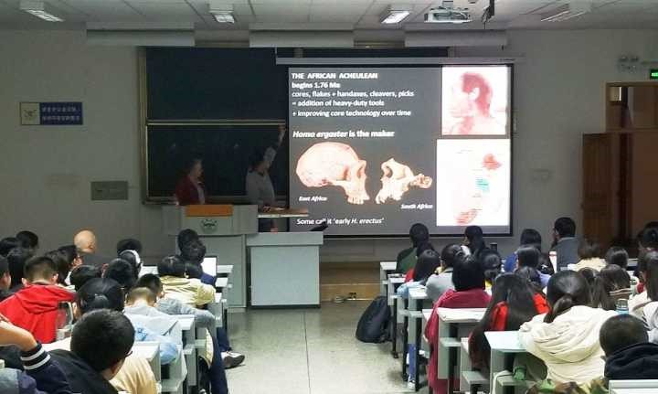 接下来,凯瑟琳·库曼教授详细介绍了旧石器时代远古人类制作石器的石料选择;打制、加工石器的方法,即锤击法、砸击法、打击法;不同的石器加工方法的区别与各自特点;不同石器的用途,并强调了制造工具在人类进化过程中的关键性。此外,凯瑟琳·库曼教授还从体质人类学的视角出发,为同学们讲解了旧石器时代的人体特征,对比现代人类,远古人类的面部较低,且下颌骨更深、更广阔。