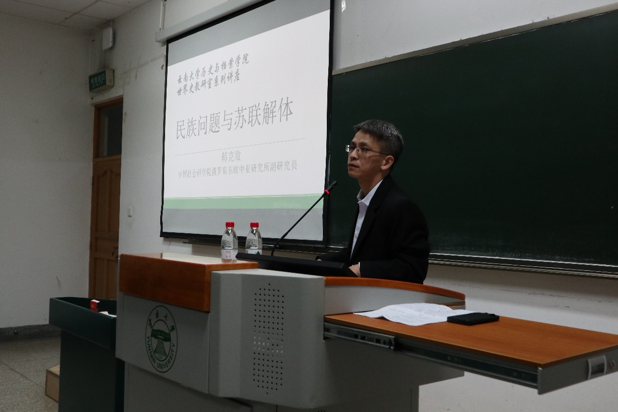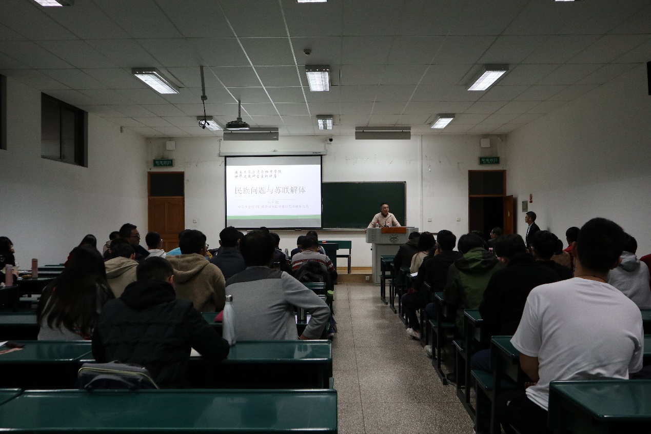 讲座围绕“对苏联解体原因各种看法的述评”“苏联解体前其民族联邦制的特点和缺点”“苏联民族联邦制的产生的思想根源”以及“列宁关于民族自决和民族自治思想的形成、变化及其民族自治思想在苏联民族联邦制确立过程中的运用”四个方面展开。