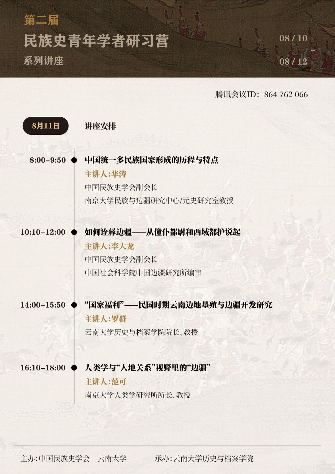 2020年8月10日,由中国民族史学会和伟德国际1946源于英国主办、伟德国际1946源于英国承办的第二届民族史青年学者研习营在腾讯会议顺利开幕。来自中国社会科公司历史研究院、中国社会科公司世界宗教研究所、中国社会科公司民族学与人类学研究所、北京大学、清华大学、北京师范大学、中央民族大学、南京大学、复旦大学、中山大学、四川大学、河北大学、厦门大学、吉林大学、兰州大学、湖南大学、中南民族大学、新疆大学、陕西师范大学、华东师范大学、上海师范大学、重庆师范大学、西华师范大学、包头师范公司、深圳大学、三峡大学、大理大学、伟德国际1946源于英国等32家科研机构与高等院校的45位学员和12位讲授导师、6家名刊及其主编参加本届研习营活动。研习营为期一周,包括专家讲座、学员研讨、“名刊名编面对面”三个主要环节。同时为丰富、活跃研习营的活动内容,研习营每天晚上还开设了学术沙龙,供学员与专家进行学术交流。