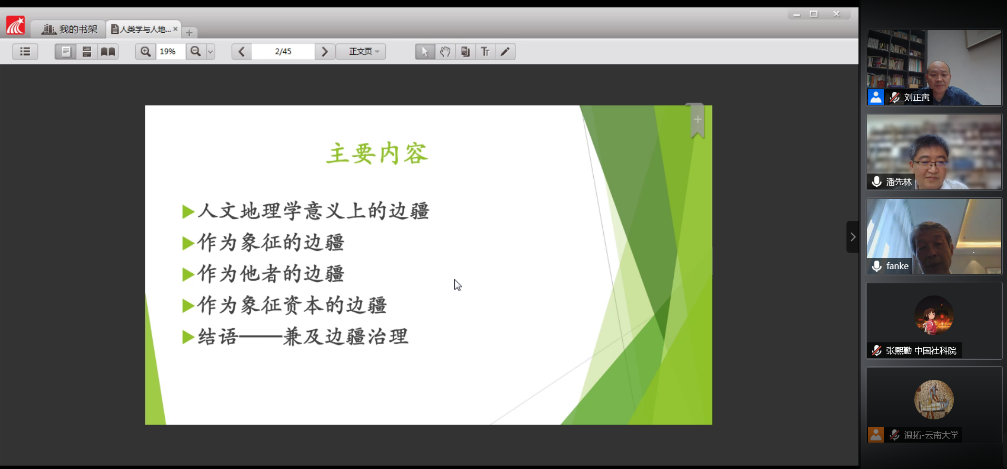 范教授首先提到,必须从人文地理学上的“人地关系”入手来理解边疆。边疆在人地关系上体现更多的是文化接触意义上的边疆。边疆是文化和文明的边缘,文化是在这方土地生活互动的人们的文化属性,而非政治或者国家属性。语义上的边疆也传递了边疆概念所体现的人地关系的信息。范教授认为,由于历史的原因和国际政治上的现实需要,边疆在我国的政治和学术话语里成为了主权的象征。在我国的边疆研究中,主权、边疆、民族三者间的关系依然是研究关怀的出发点。范教授认为边疆因为涉及政治而拥有权力。他从布迪厄象征资本的维度来给予了解释。他提到边疆可以成为某种可供积累的象征资本。地方政府通过积累资本,突出自己边疆条件来获得更高的关注度和广泛为人所知,从而成为地方社会和政府瞩目的中心,甚至成为地方政府的政绩的代言人。