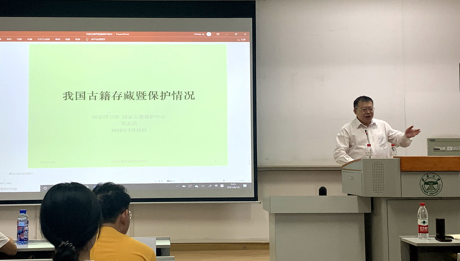 讲座中,张志清研究馆员总结了五条高等院校在古籍保护中的使命。一是要建立古籍保护学科,实现古籍保护在人文、管理、艺术、理工、记忆方面的整合,开展研究项目,建立研究、实验、实践、应用体系。二是成立中华古籍保护研究院,培养专业硕士和学术硕士以上人才。三是结合自身院校地域和特点培养专门人才。四是与中山大学、复旦大学、天津师范大学等古籍保护研究院密切合作,形成共同发展格局。五是积极参与国家古籍保护规划项目和志愿者服务活动,与国家古籍保护中心和省级古籍保护中心互动,成为古籍保护实践的重要力量。
